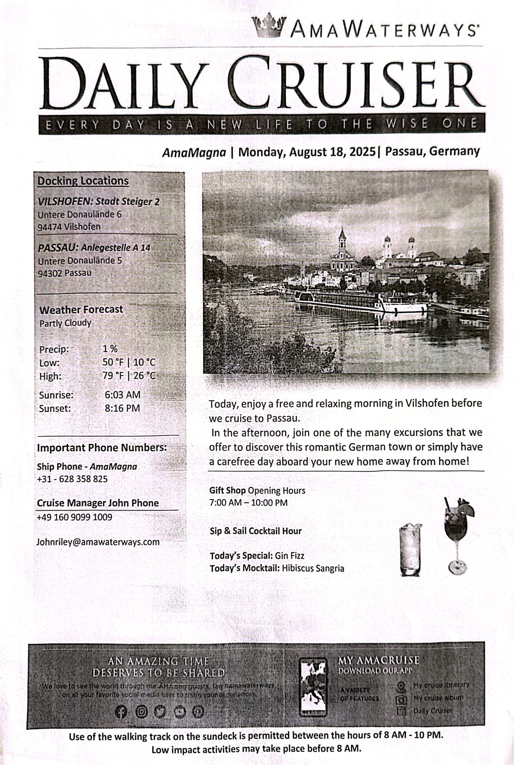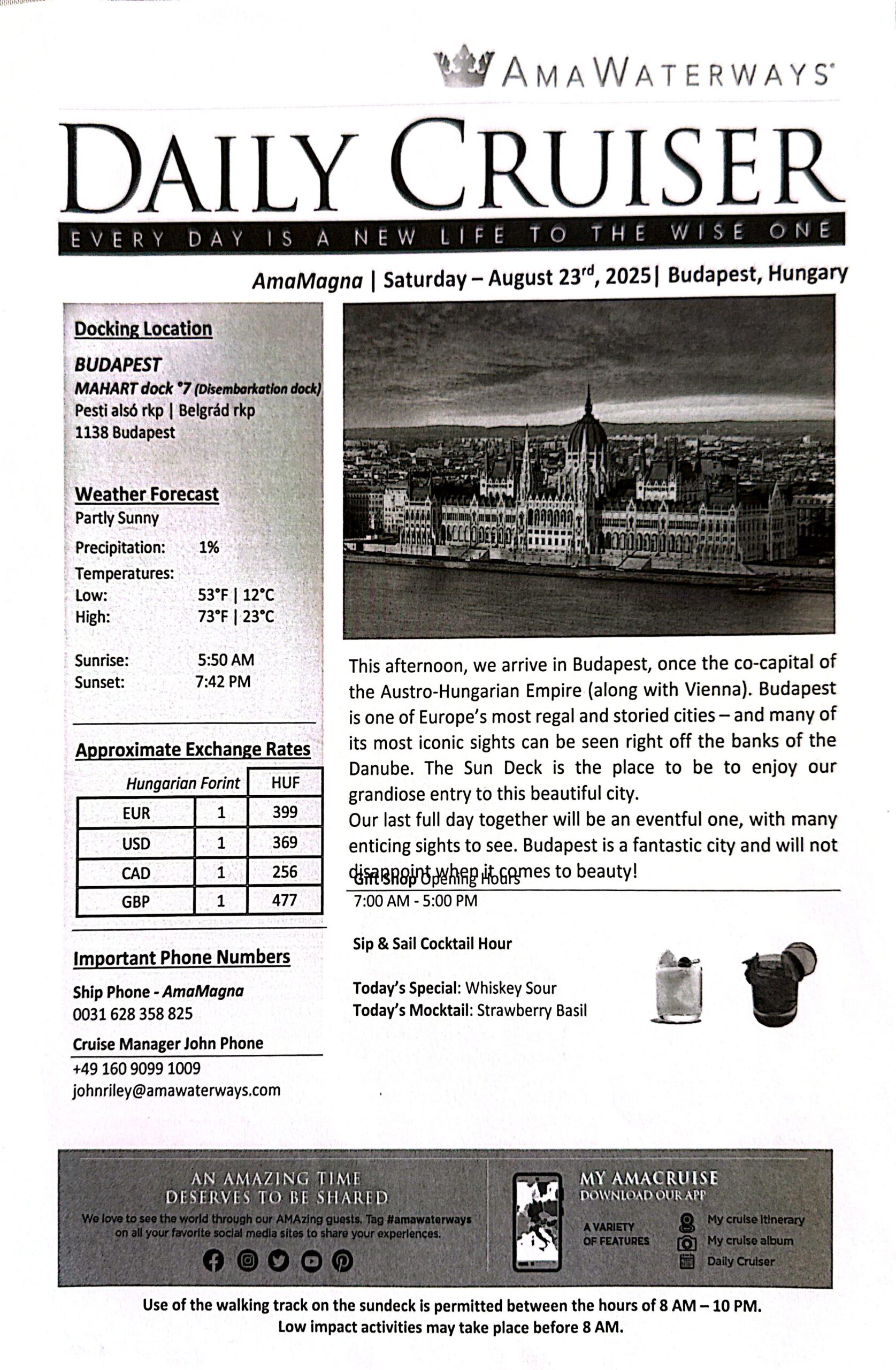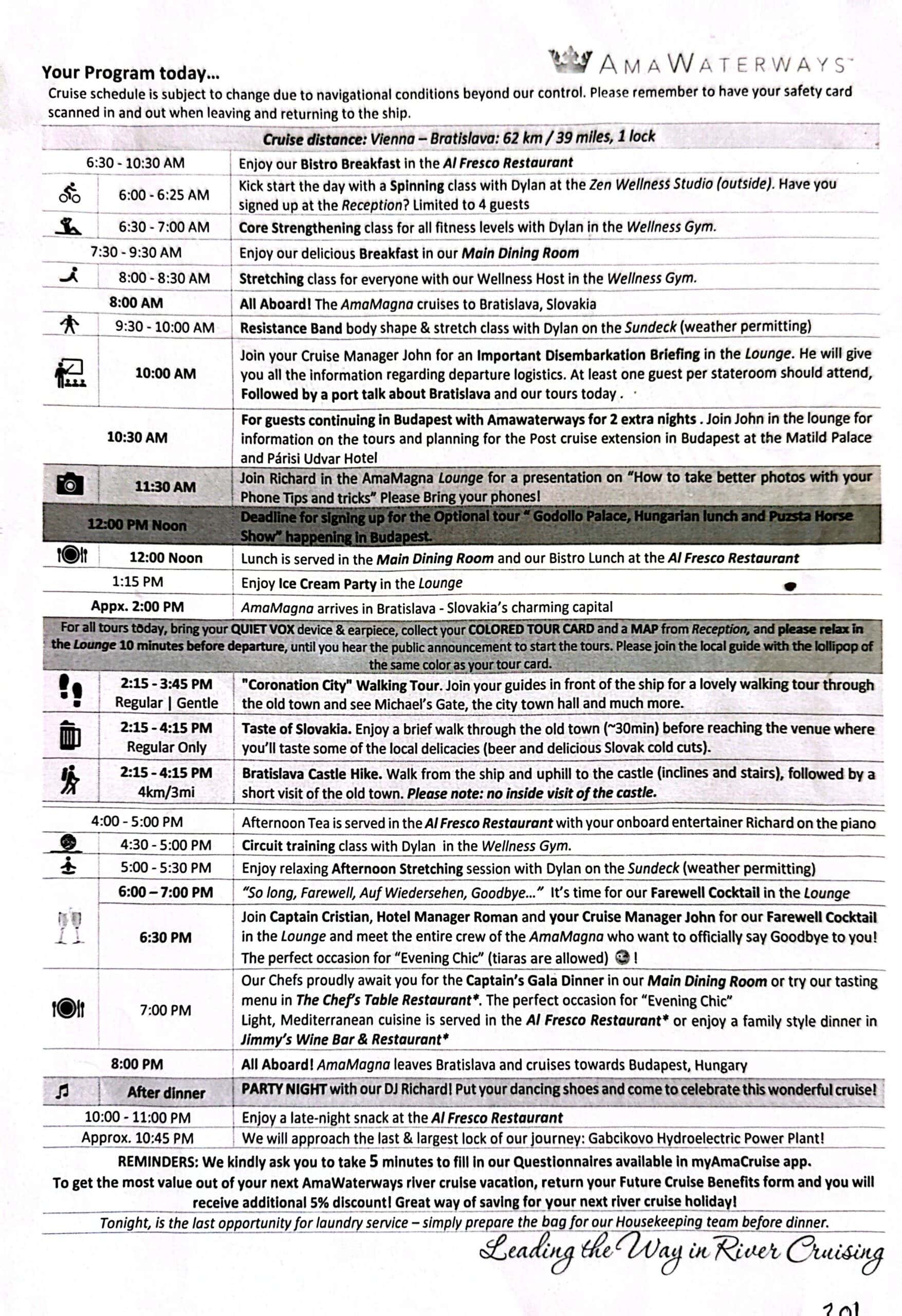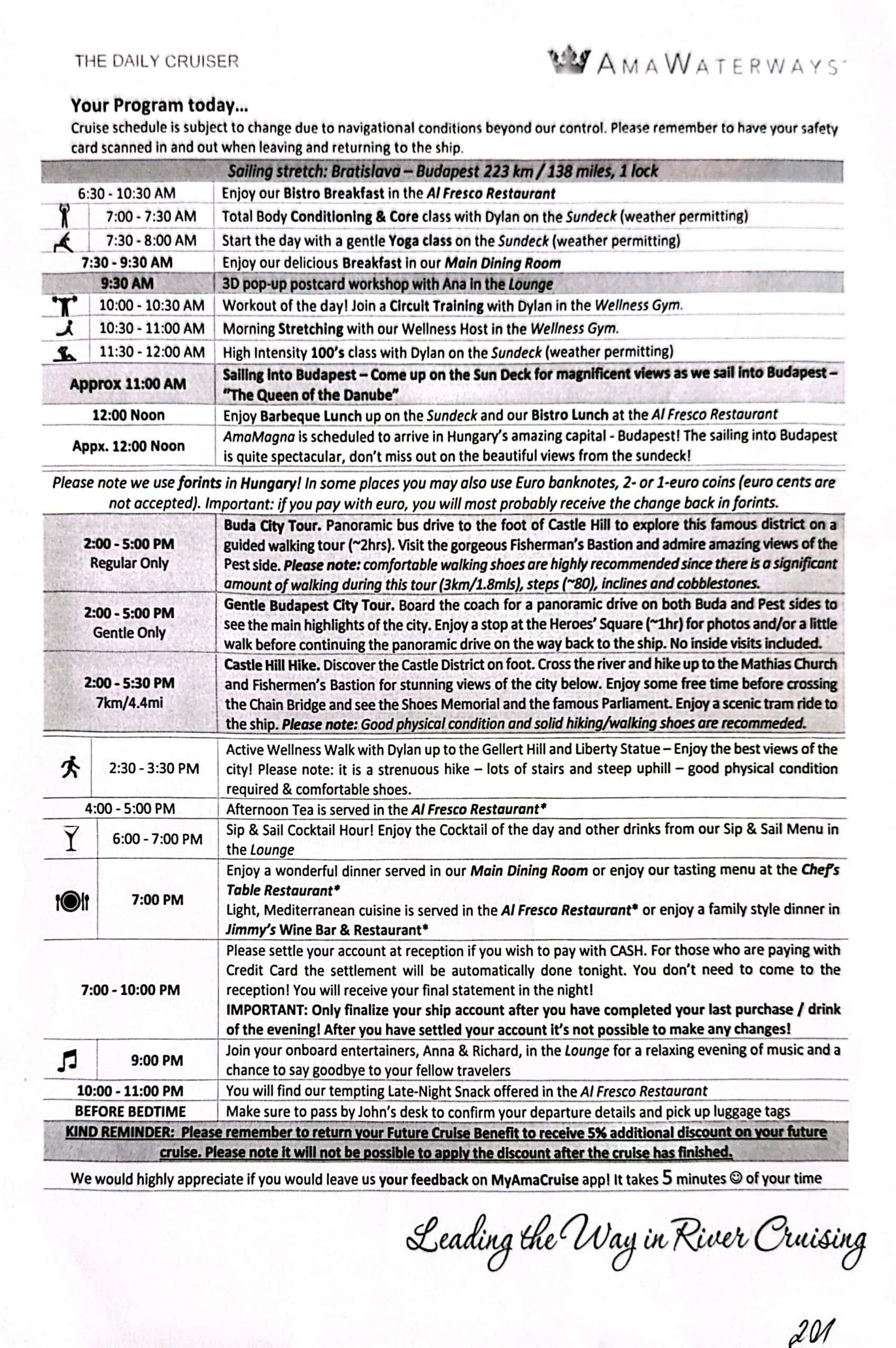 We recently went on a Danube River cruise with Ama Waterways on the beautiful Ama Magna. Here are the daily planners we had for our 7 day cruise from Vilshofen, Germany to Budapest, Hungary.