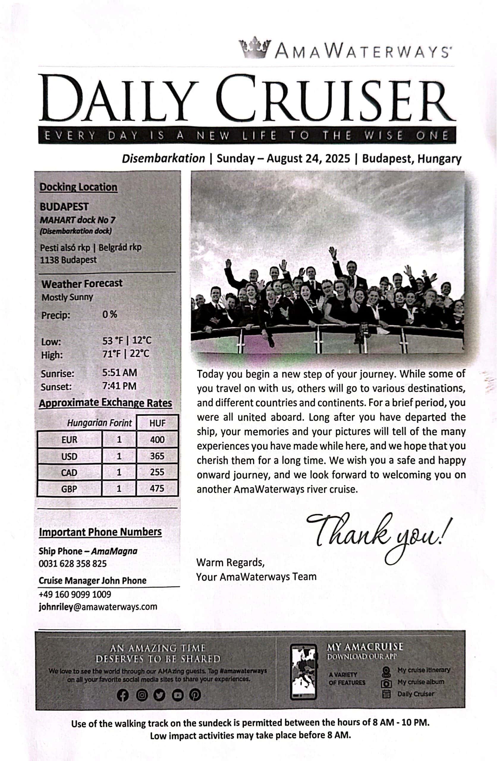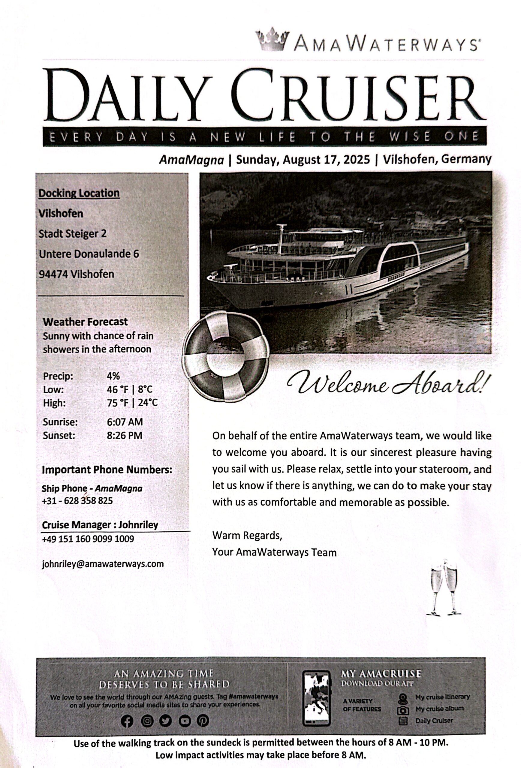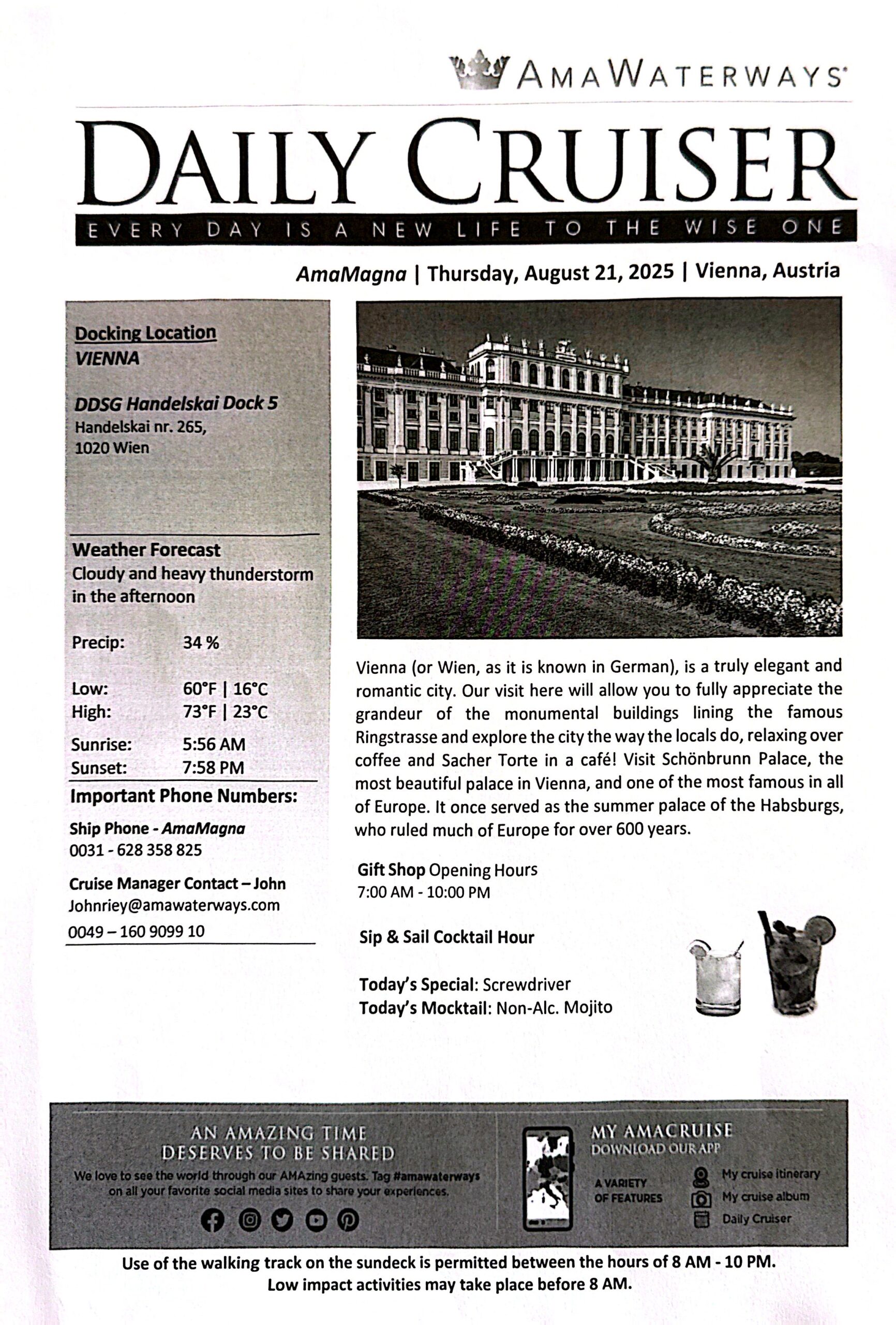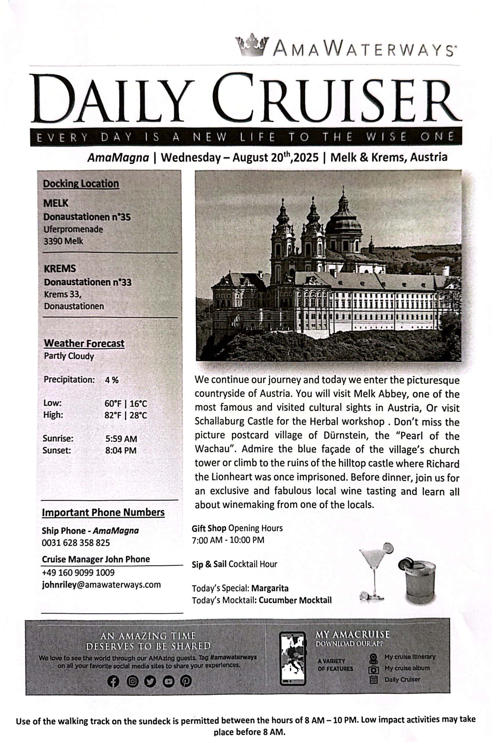 We recently went on a Danube River cruise with Ama Waterways on the beautiful Ama Magna. Here are the daily planners we had for our 7 day cruise from Vilshofen, Germany to Budapest, Hungary.