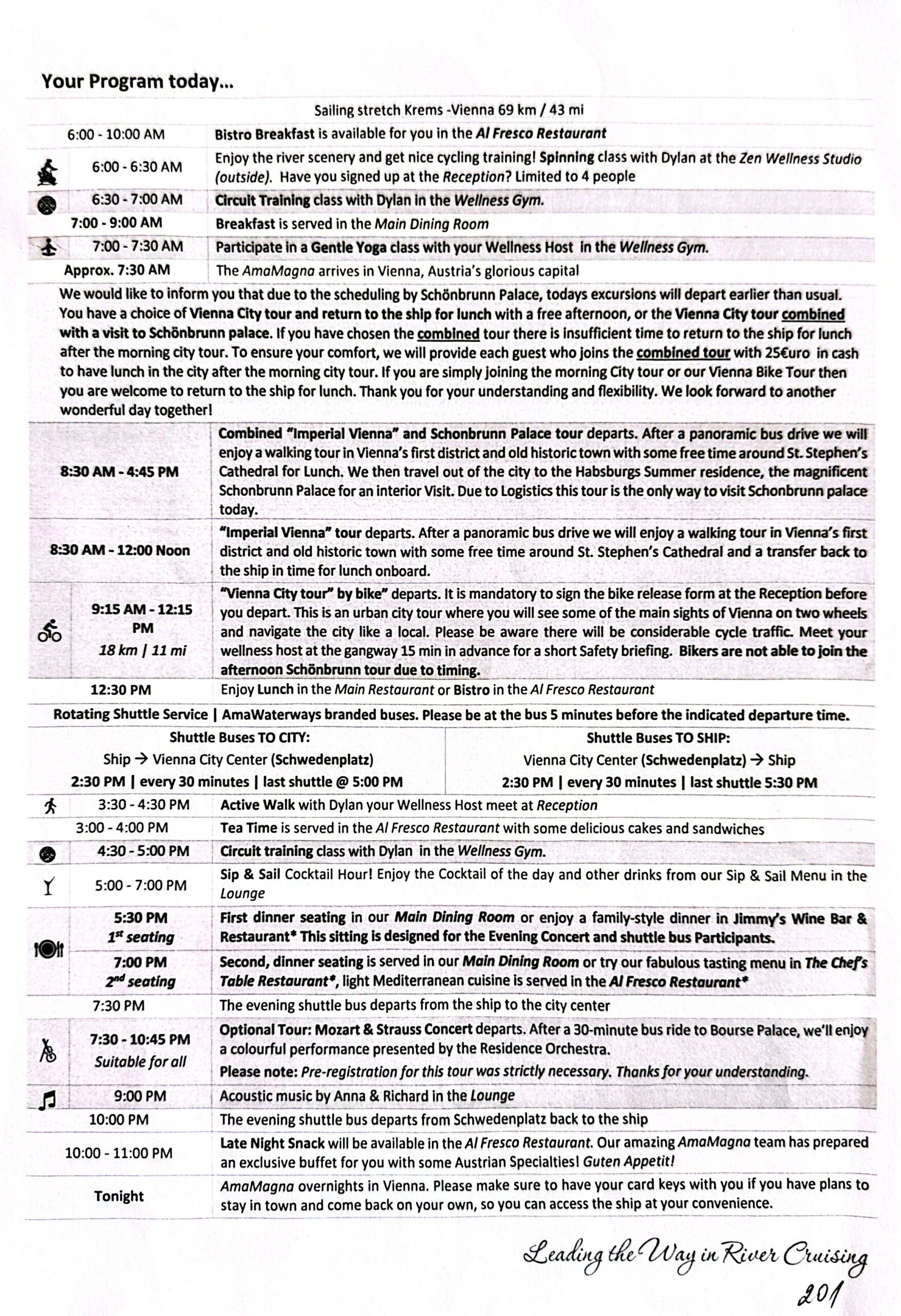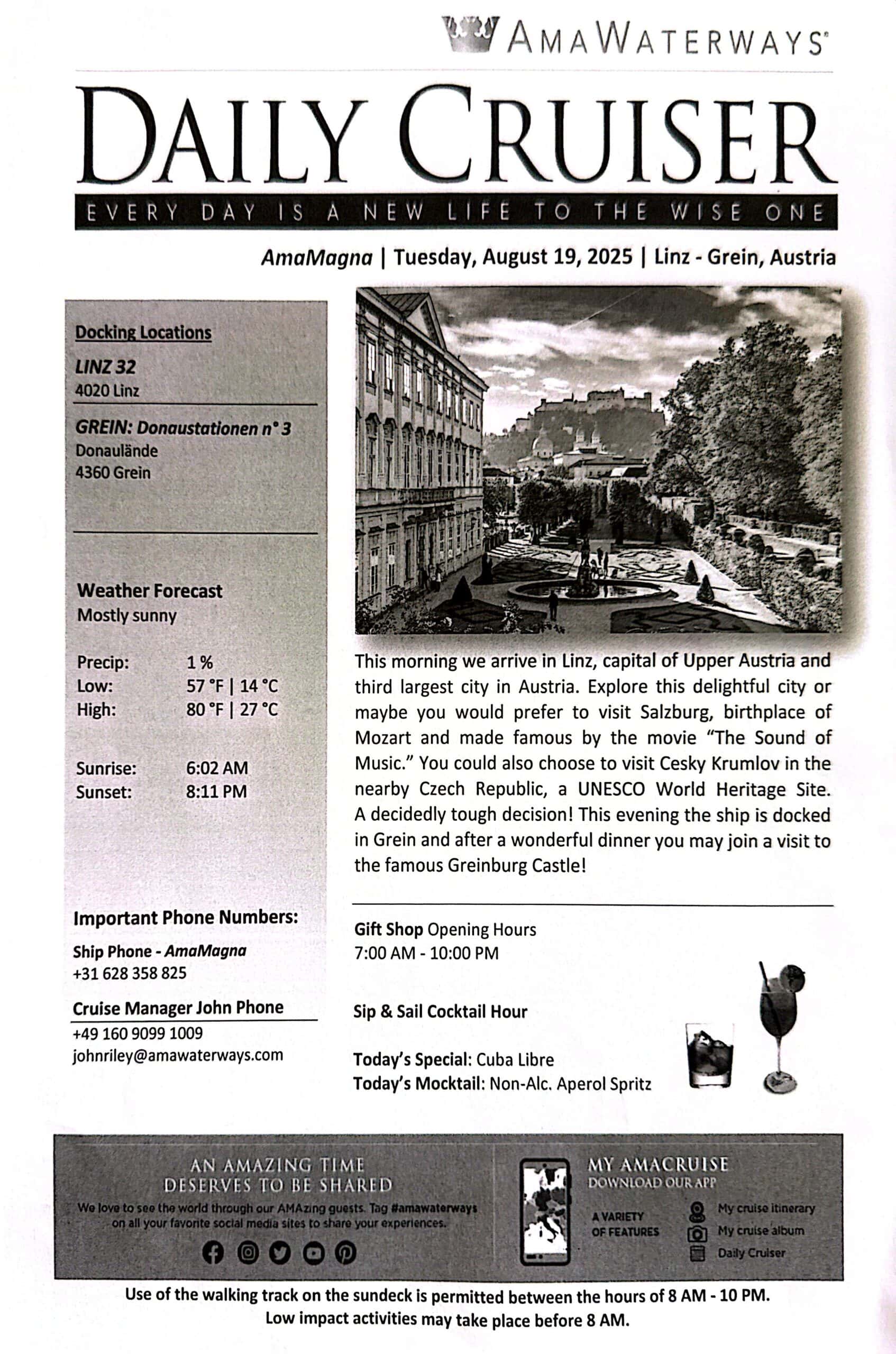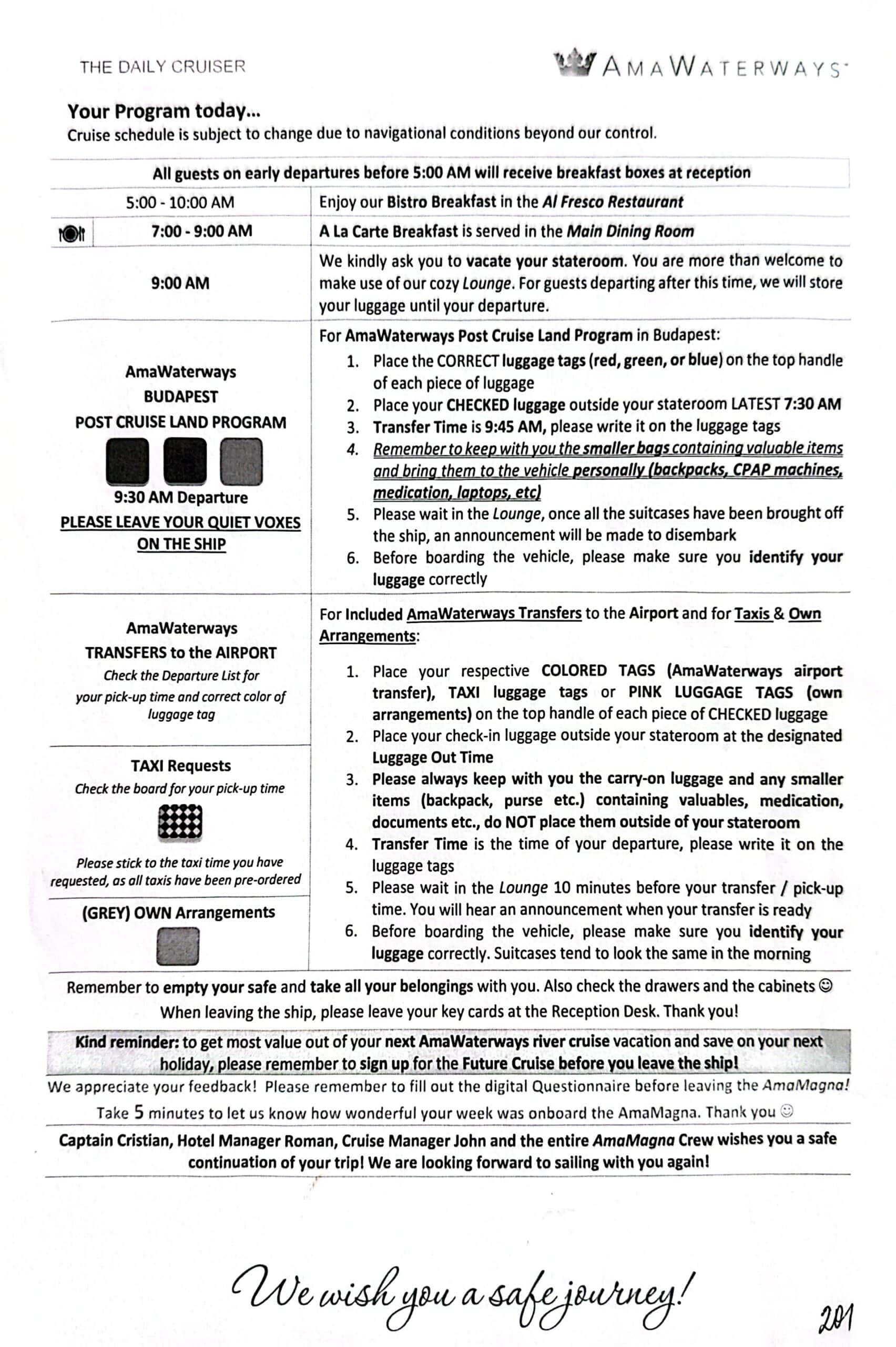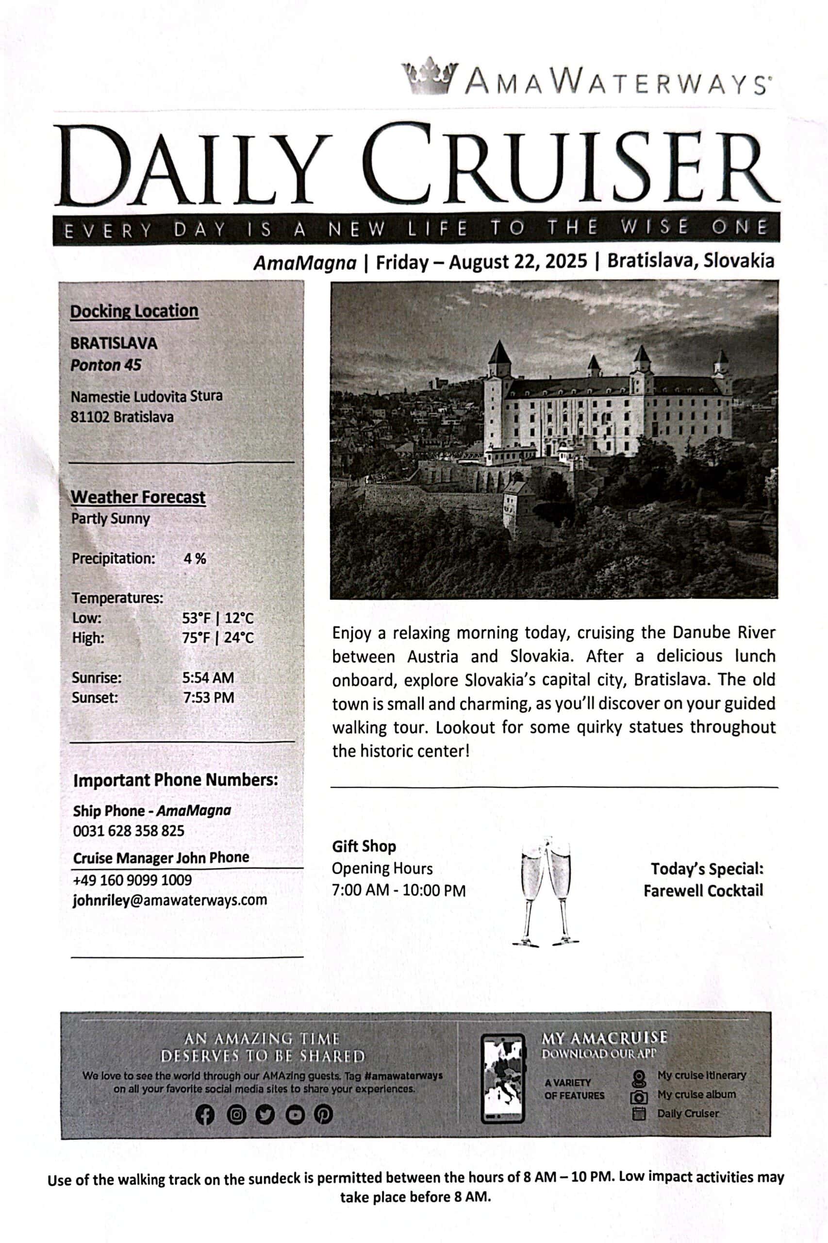 We recently went on a Danube River cruise with Ama Waterways on the beautiful Ama Magna. Here are the daily planners we had for our 7 day cruise from Vilshofen, Germany to Budapest, Hungary.