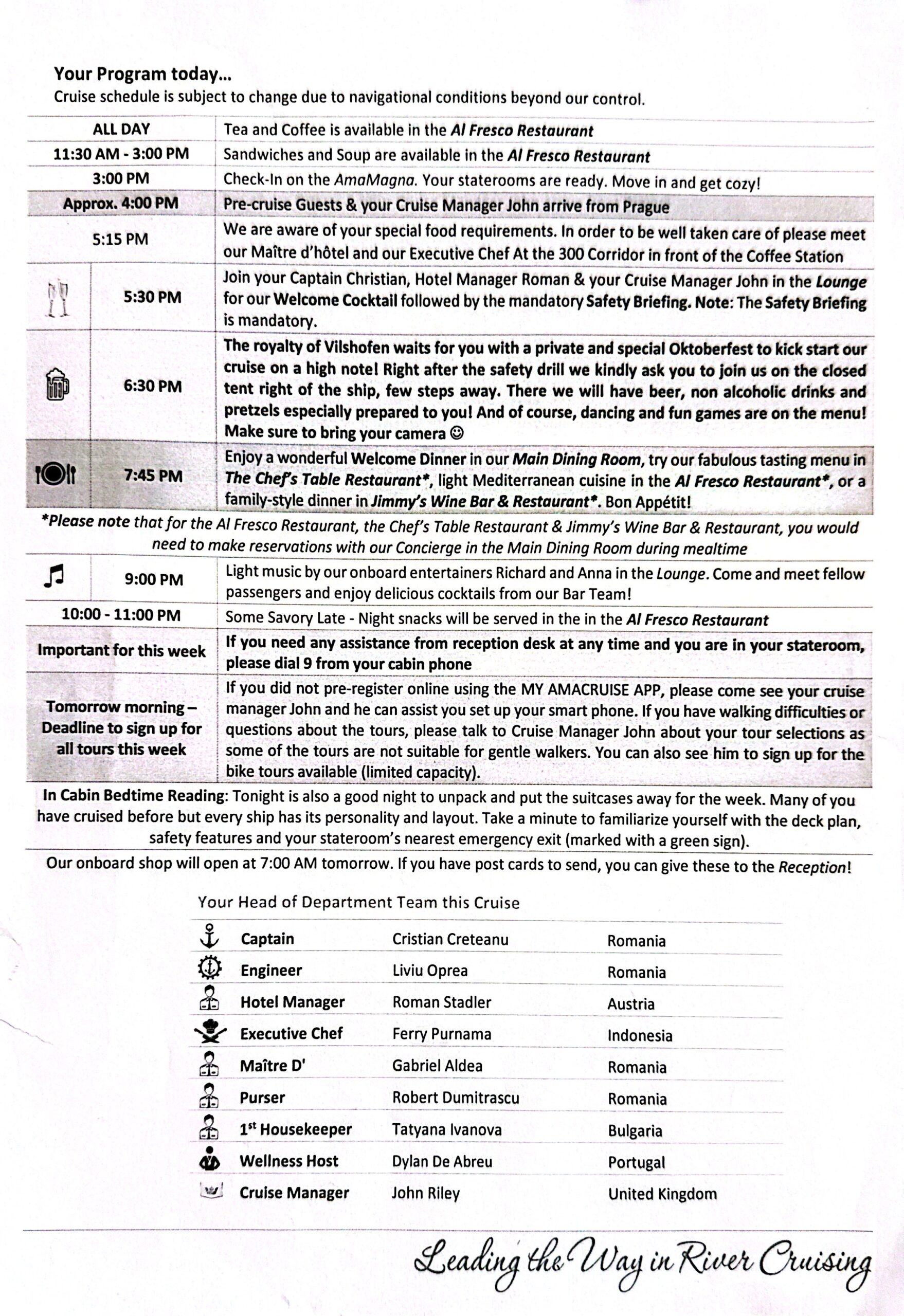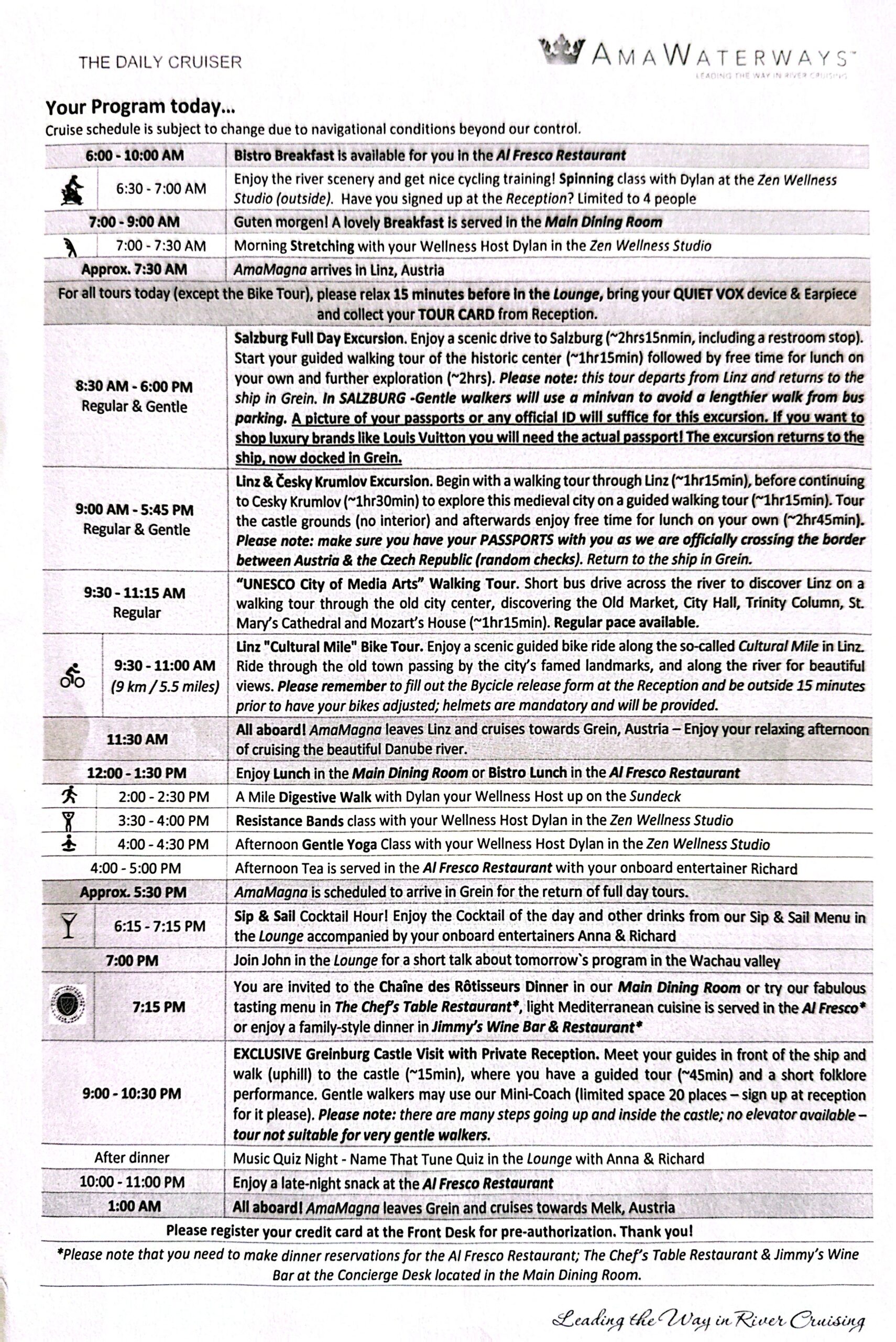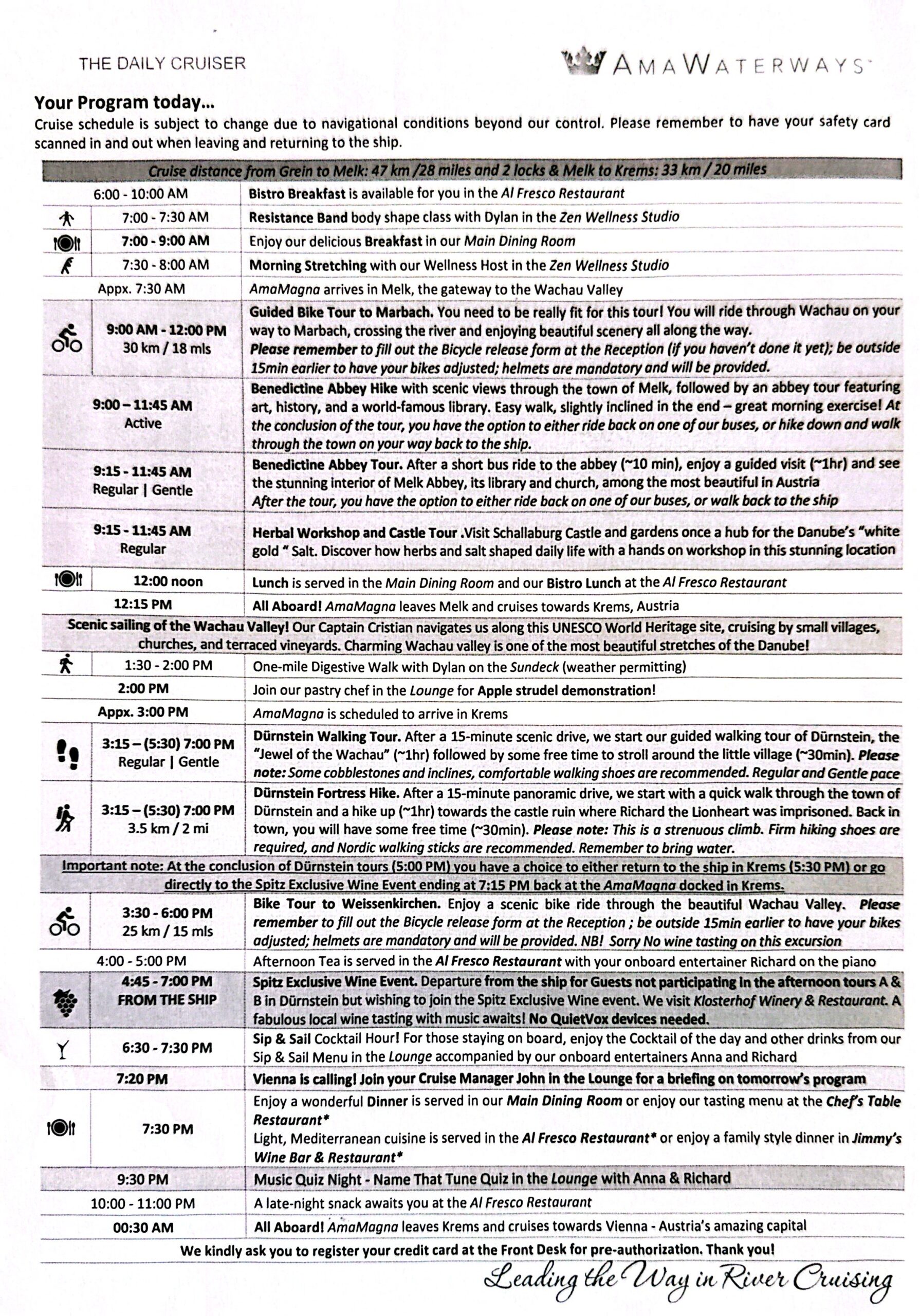 For reference, our river cruise was in August. All activities are also available on your AmaWaterways App.