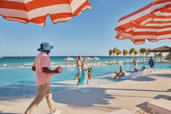 The Pearl Cove Beach Club is another exclusive adults-only retreat. Guests will enjoy an 11,000-square-foot private infinity pool, stylish sun loungers with pink-striped umbrellas, a swim-up bar, and a full-service restaurant and lounge with both indoor and outdoor seating.